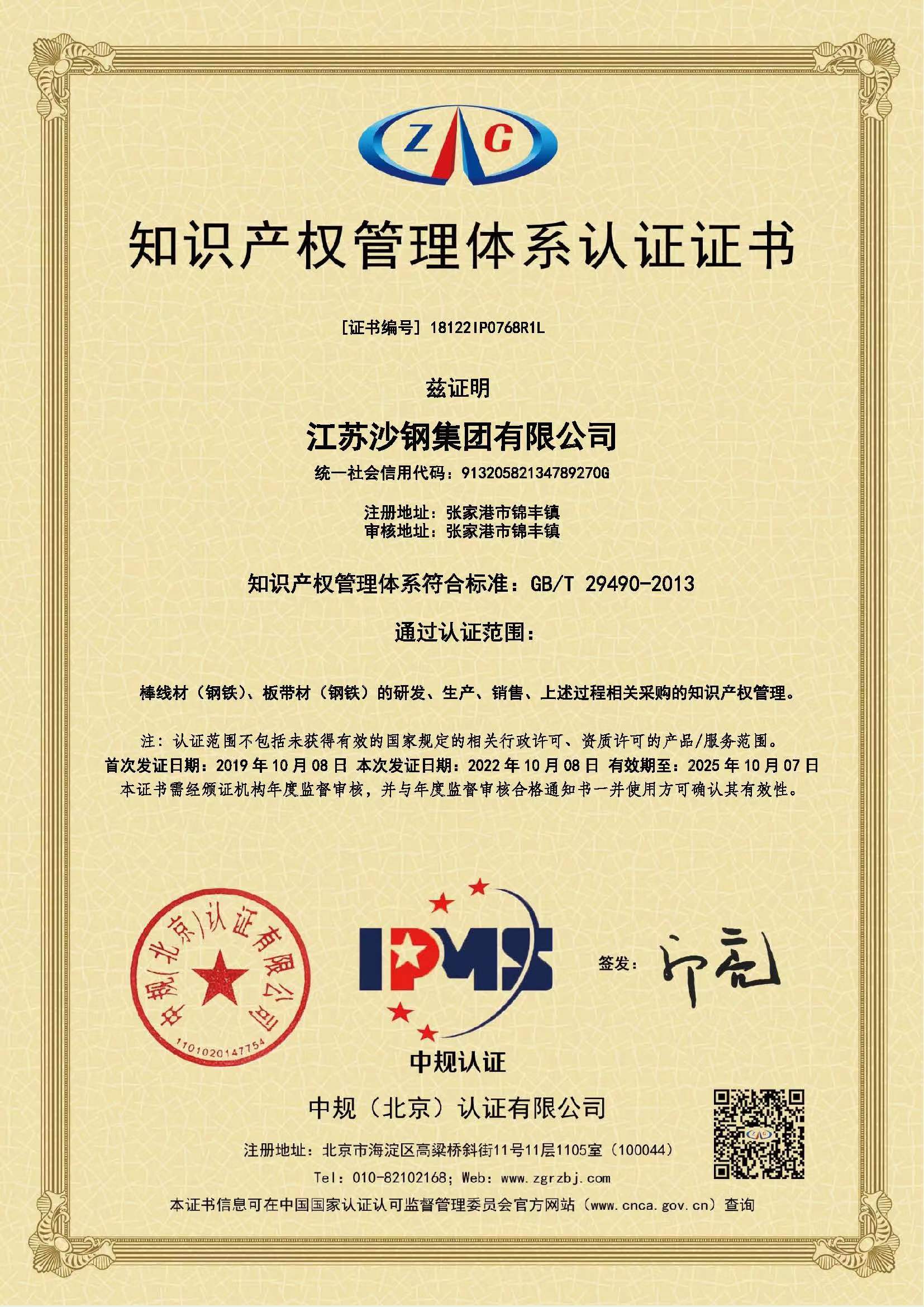 知識產權管理體系認證證書