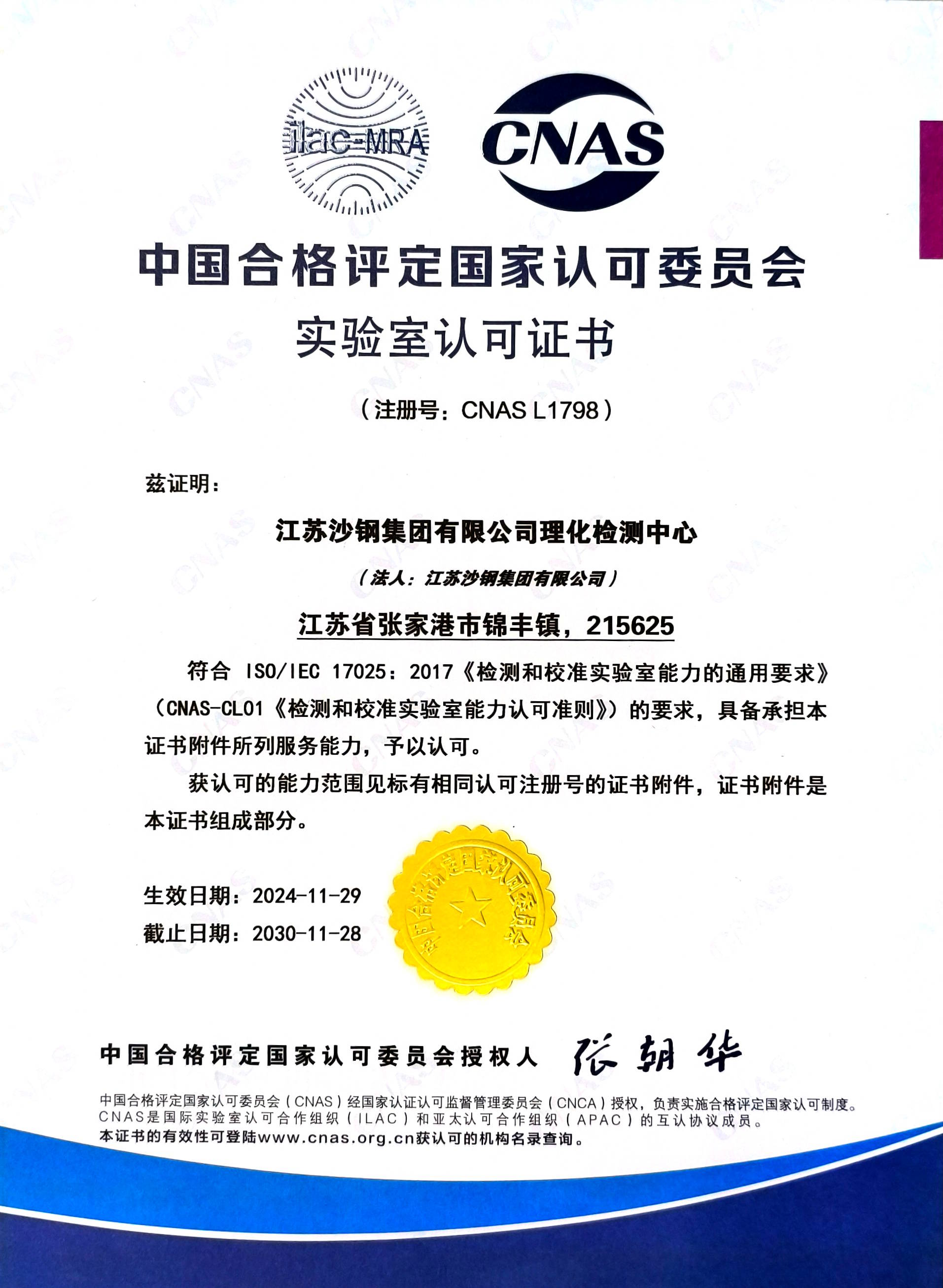 理化試驗室CNAS認可證書